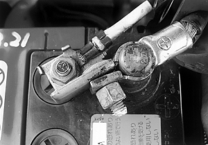 バッテリーのプラス側ターミナルから取り出されているABS回路の電源端子(上側の細い方のハーネス)